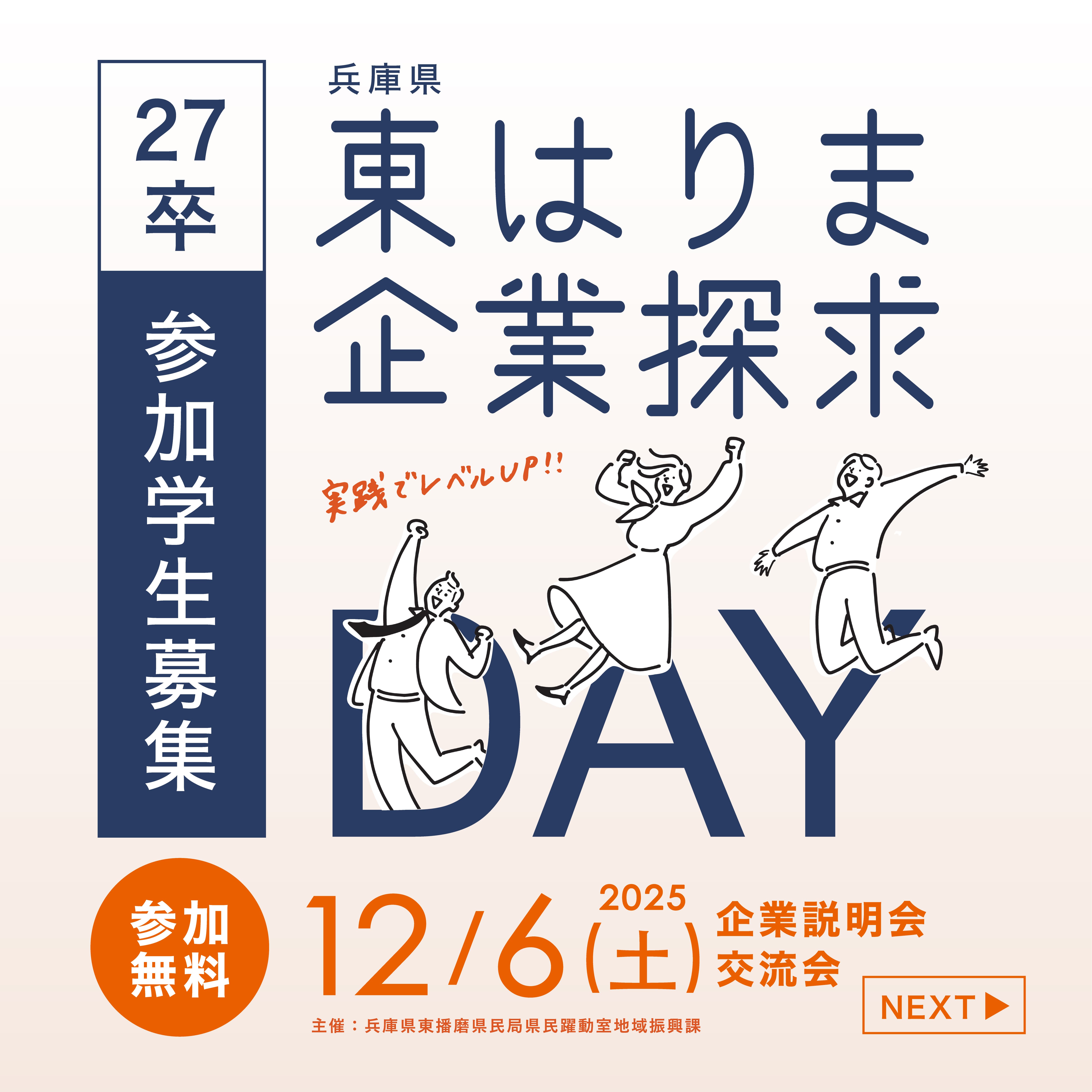 東播磨地域(明石市、加古川市、高砂市、稲美町、播磨町)には、優れた技術を持つ魅力的な地元企業が多数あります。令和8、9年3月卒業予定の大学生等に対し、こうした東播磨の企業の魅力をPRするイベントを実施するので、参加者を募集します。
