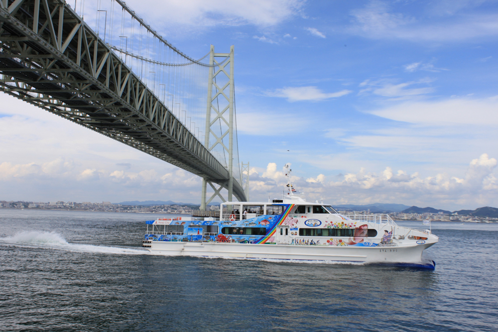 多くの船が行き交う風光明媚な明石海峡を航行し、明石海峡大橋の下をくぐり抜けるダイナミックな景観を満喫することができる「淡路ジェノバライン」。明石港を出発し、淡路島の岩屋港で折り返す約40分のミニクルーズ体験です。(岩屋港では船内点検のため、一旦下船していただきます)