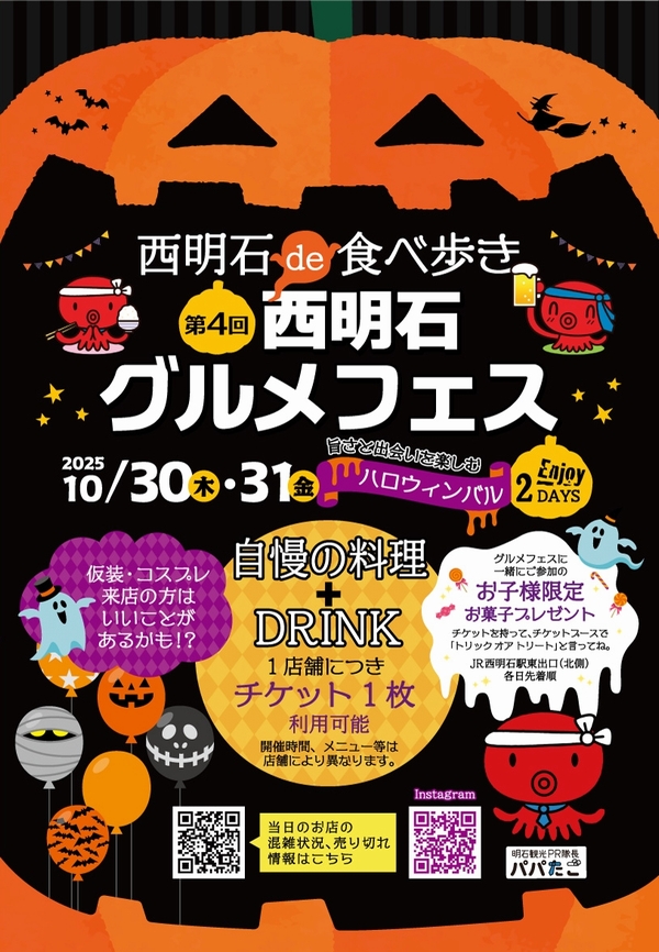 第4回西明石グルメフェスが、ハロウィン前夜の10月30日から当日31日の2日間に渡って開催されます。フェス公式参加マップを見ながら、お店自慢の一品とドリンクを楽しめる食のイベント。和食、中華、洋食、カフェ、バー、麺、お寿司など多彩な36店舗がラインナップ。以前からちょっと気になっていたお店や、初めて知るお店に立ち寄ってみる絶好のチャンスです!