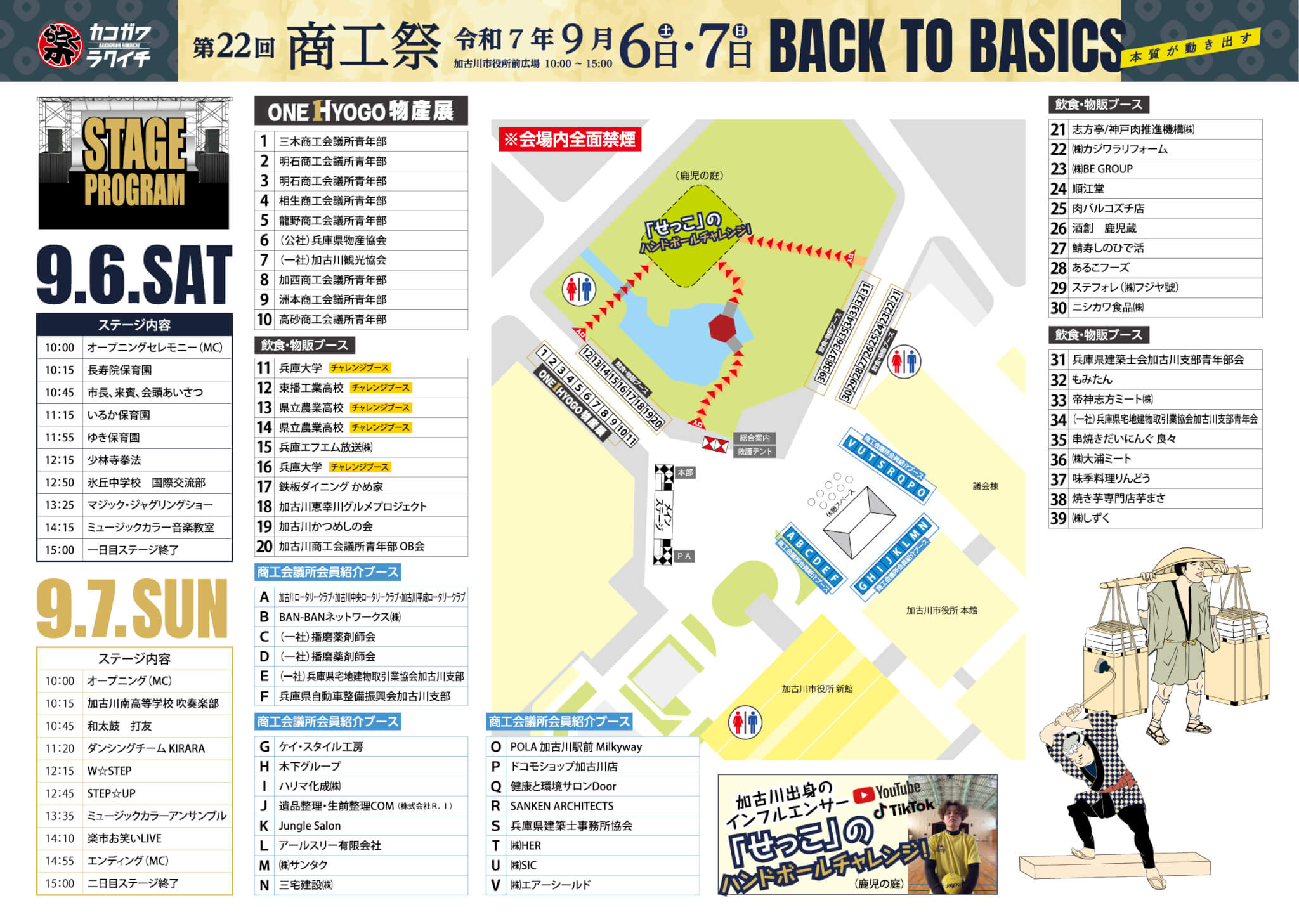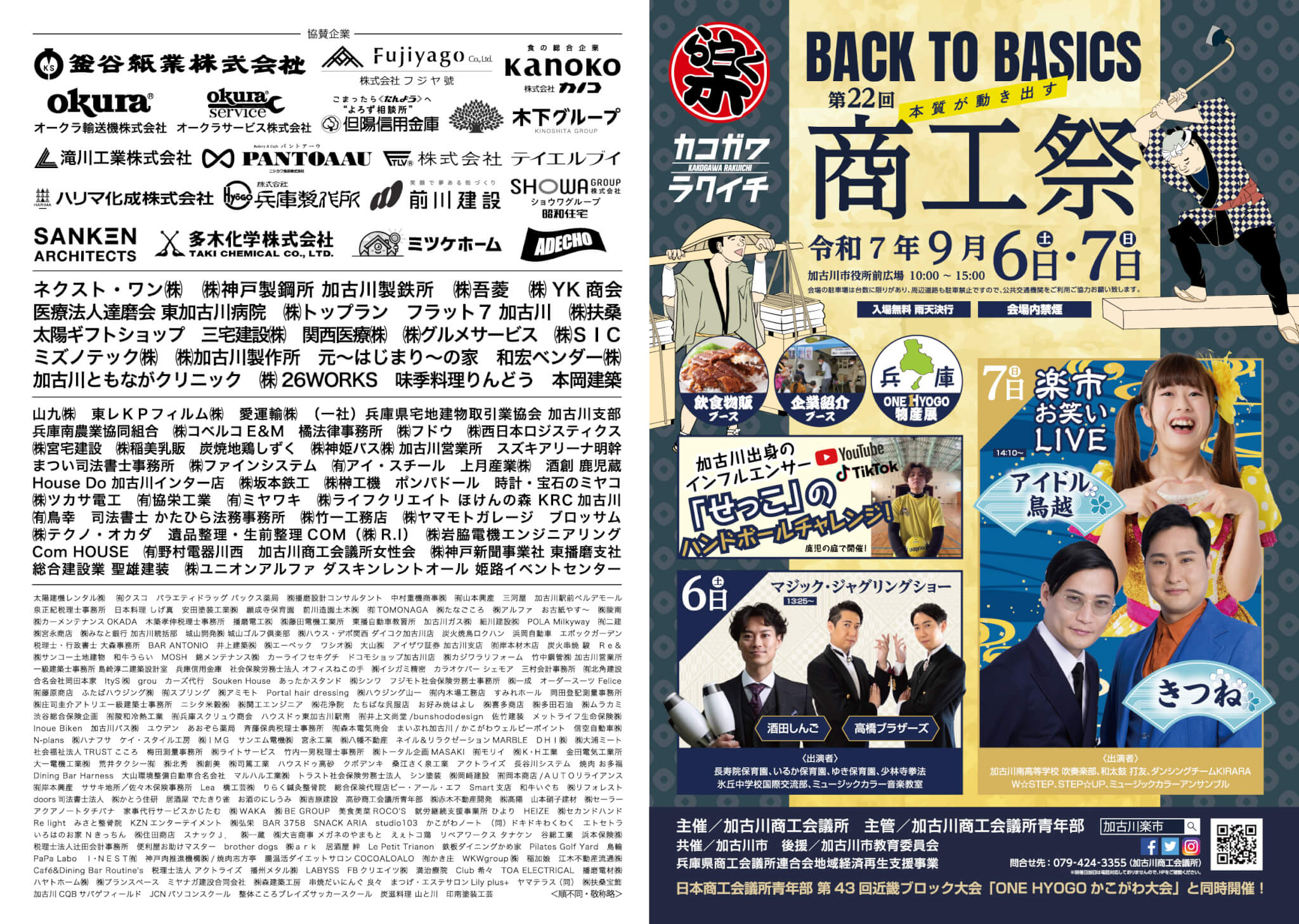 毎年加古川で開催される人気イベントが今年は9月頭の土日開催! 1日目にはマジック・ジャグリングショーがあり、2日目のお笑いライブには「きつね」「アイドル鳥越」の2組が登場します! また、鹿児の庭では、加古川出身のインフルエンサー「せっこ」さんのハンドボールチャレンジが2日間開催されます。 兵庫の物産展ブースや飲食ブース、加古川商工会議所の会員紹介ブースも多数用意されています!