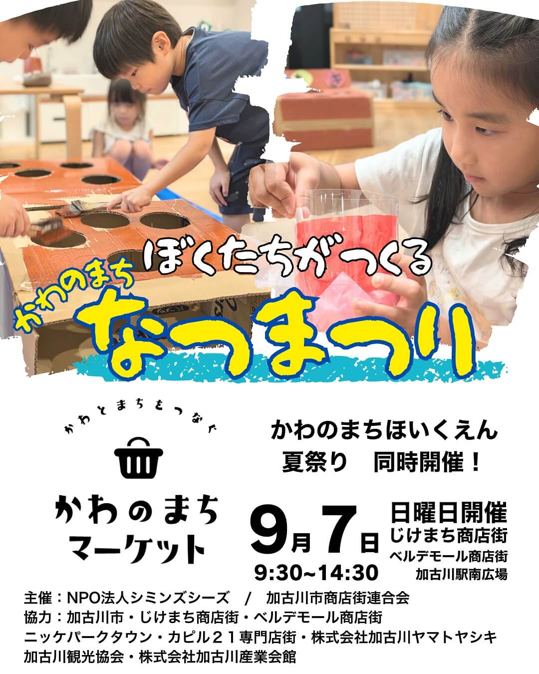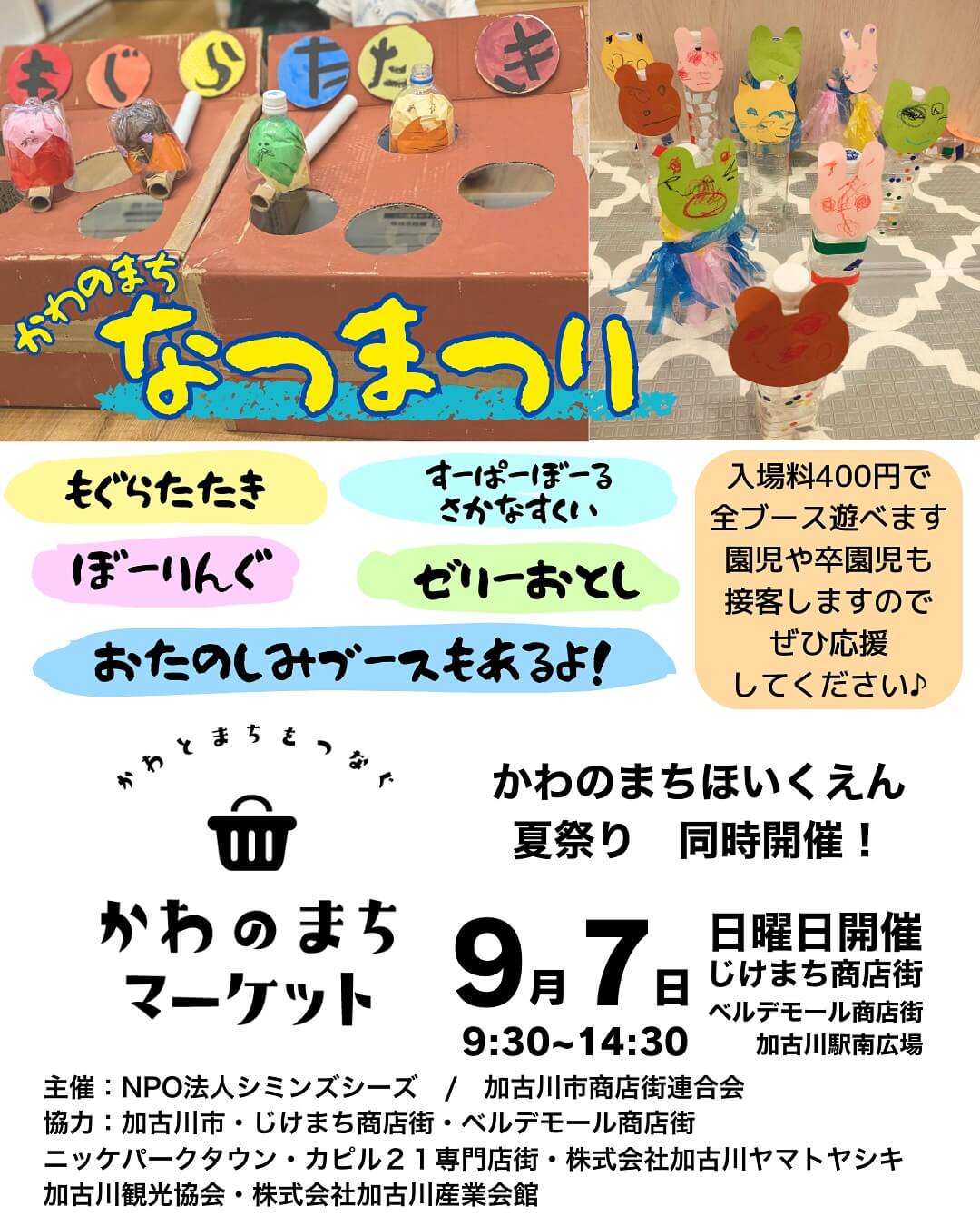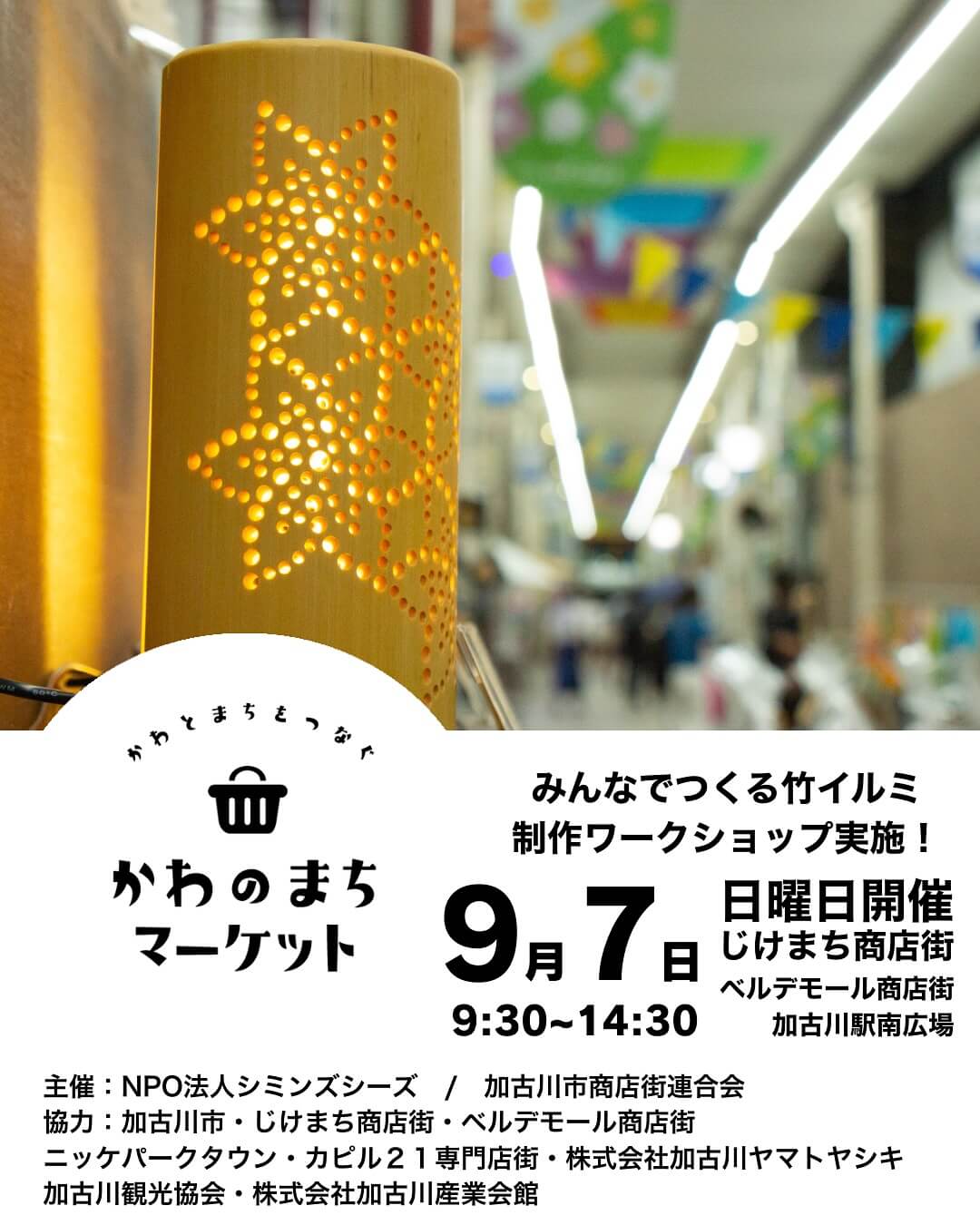 9月のかわのまちマーケットは、竹イルミネーション制作ワークショップ(参加無料・事前予約不要)と、かわのまちほいくえん夏祭りの同時開催です! ワークショップで作った竹ランタンは、11/2~12/28の「かわのまちイルミ」でじけまち商店街入口に設置予定です。 なつまつりはかわのまちほいくえん園舎内・園舎前(かわのまちリビング1階)で開催。入場料400円で全ブースが遊べます!
