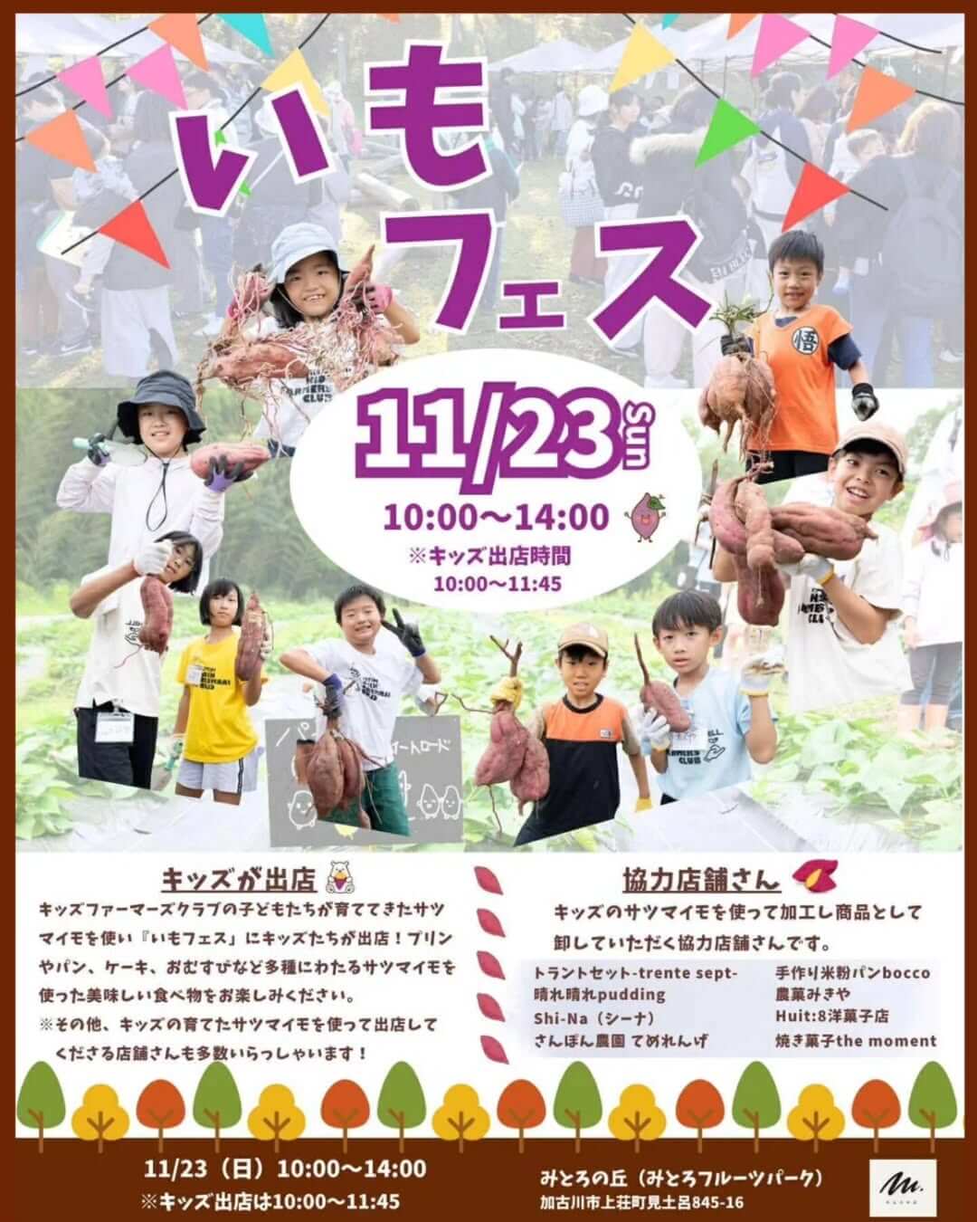 キッズファーマーズクラブの子どもたちが苗植えから頑張って育てたさつまいもを、地域の事業者さんに加工してもらい、子どもたち自身が販売します! 子どもたちの出店以外にも、たくさんの”さつまいも”の出店があります。